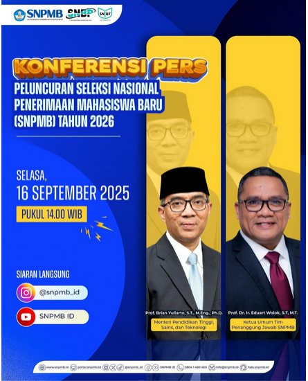 Peluncuran informasi Seleksi Nasional Penerimaan Mahasiswa Baru Tahun 2026 akan disampaikan pada Selasa, 16 September 2025 (pukul 14.00 WIB) oleh Menteri Pendidikan Tinggi, Sains dan Teknologi beserta Ketua Umum Tim Penanggung Jawab SNPMB.